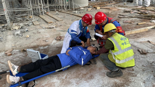 本次應(yīng)急演練模擬建筑施工作業(yè)過程中石盤大橋盤扣式支架倒塌導(dǎo)致物體打擊。安全管理人員接到現(xiàn)場事故匯報(bào)后,立即上報(bào)至項(xiàng)目部,項(xiàng)目負(fù)責(zé)人立刻成立現(xiàn)場傷員救援組并對傷員進(jìn)行緊急救援,在簡單止血、包扎處理后,救護(hù)車將傷員送往就近醫(yī)院救治。模擬演練的整個(gè)過程,檢驗(yàn)各小組在工程項(xiàng)目發(fā)生事故時(shí)的快速反應(yīng)能力,井然有序、反應(yīng)迅速、措施有效,達(dá)到了演習(xí)預(yù)期目的。