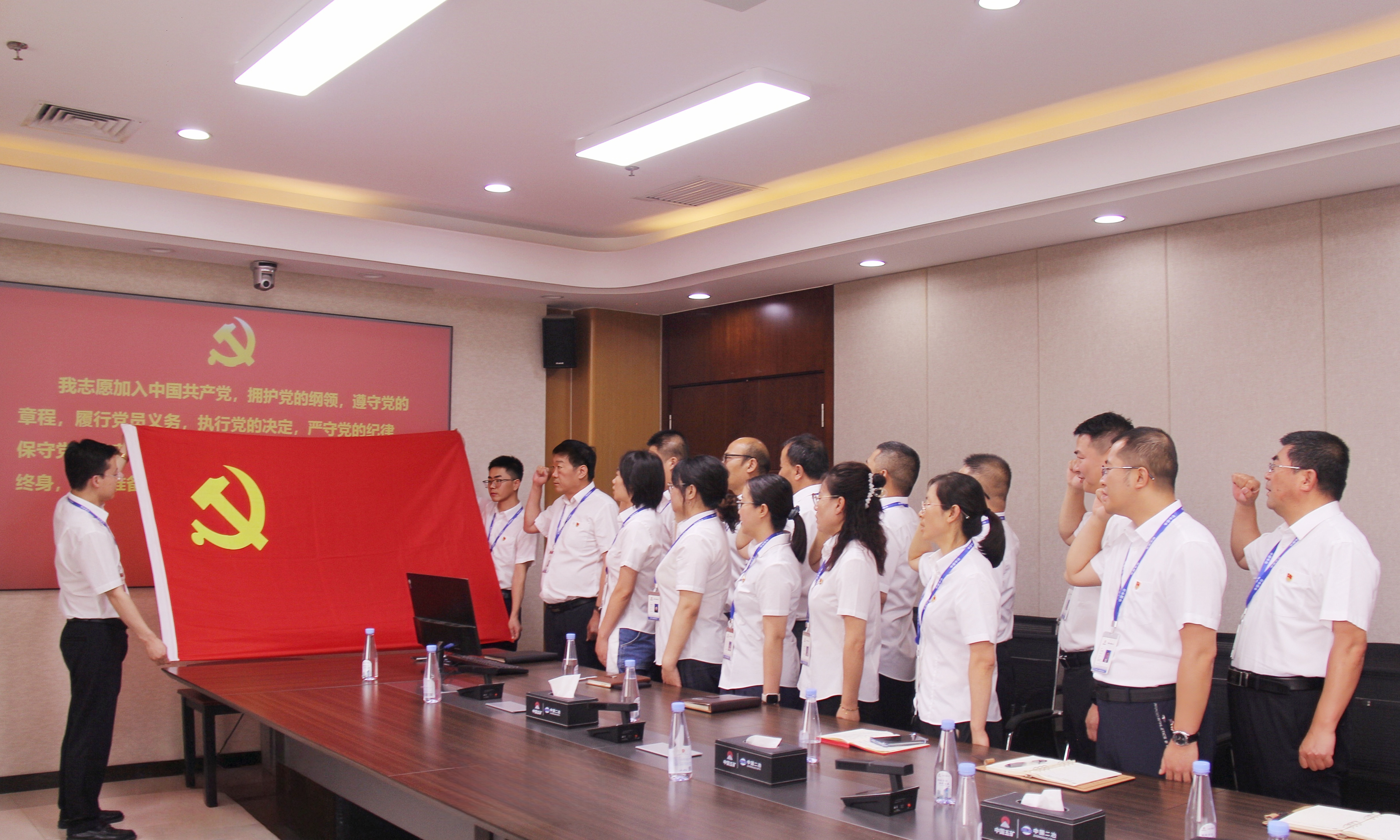 分公司機(jī)關(guān)黨支部全體黨員在領(lǐng)誓人的帶領(lǐng)下,整齊列隊(duì),面對(duì)鮮紅的中國(guó)共產(chǎn)黨黨旗,高舉右拳,齊聲莊嚴(yán)宣誓。