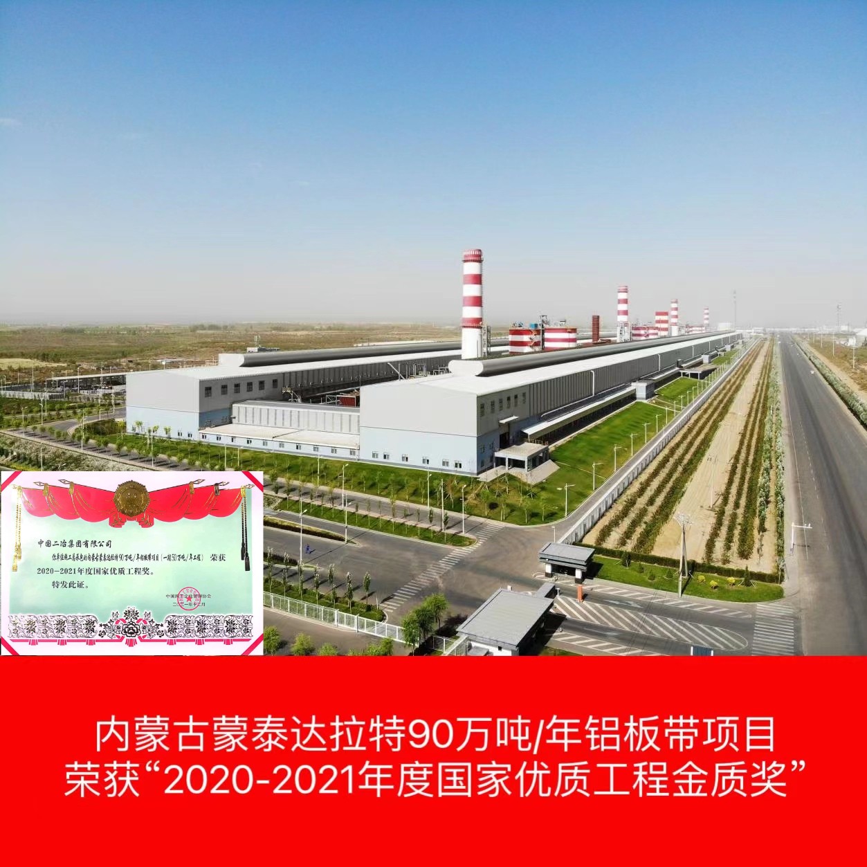 內蒙古蒙泰達拉特90萬噸/年鋁板帶項目(一期50萬噸電解鋁工程)屬于內蒙古積極響應國家循環經濟資源綜合利用示范項目,項目采用500KA預焙陽極鋁電解槽及配套的煙氣干法凈化技術及與之配套的供電整流、鑄造、電解煙氣凈化等工程。獲得“2020-2021年度國家優質工程金質獎”。