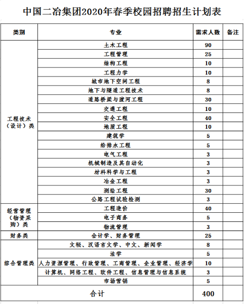 公司 2020 年春季招聘計劃招收總計 400 人(詳見附件)。