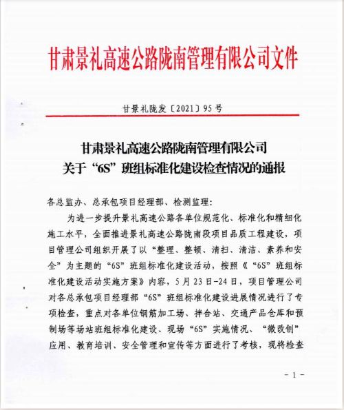 為進(jìn)一步提升景禮高速公路各單位規(guī)范化、標(biāo)準(zhǔn)化和精細(xì)化施工水平,全面推進(jìn)景禮高速公路隴南段項目品質(zhì)工程建設(shè),春節(jié)過后,隴南段項目管理公司組織開展了以“整理、整頓、清掃、清潔、素養(yǎng)、安全”為主題的“6S”班組標(biāo)準(zhǔn)化建設(shè)活動,按照《“6S”班組標(biāo)準(zhǔn)化建設(shè)活動實施方案》內(nèi)容。
