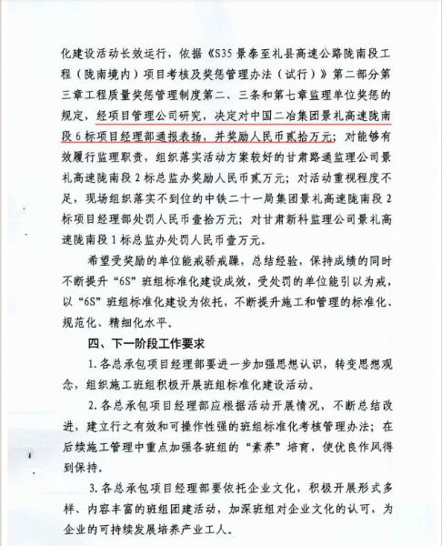 景禮項目部精心組織,合理安排,認(rèn)真組織實施。5月23日-24日,項目管理公司對各總承包項目經(jīng)理部“6S” 班組標(biāo)準(zhǔn)化建設(shè)進(jìn)展情況進(jìn)行了專項檢查,重點檢查了鋼筋加工場、拌合站、交通產(chǎn)品倉庫和預(yù)制場等場站班組標(biāo)準(zhǔn)化建設(shè)、現(xiàn)場“6S” 實施情況、“微 改創(chuàng)”應(yīng)用、教育培訓(xùn)、安全管理和宣傳等方面。依據(jù)《S35 景泰至禮縣高速公路隴南段工程(隴南境內(nèi))項目考核及獎懲管理辦法(試行)》第二部分第三章工程質(zhì)量獎懲管理制度第二、三條和第七章監(jiān)理單位獎懲的規(guī)定,經(jīng)項目管理公司研究,決定對中國二冶集團景禮高速隴南段6標(biāo)項目經(jīng)理部通報表揚,并獎勵人民幣貳拾萬元。