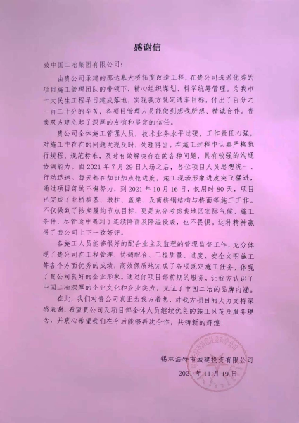 11月19日,錫林浩特市城建投資有限公司發(fā)來(lái)感謝信,對(duì)中國(guó)二冶在錫林浩特市那達(dá)慕大橋拓寬改造工程中良好的履約精神給予高度認(rèn)可,對(duì)參與項(xiàng)目建設(shè)的全體人員付出的努力和汗水表示感謝。