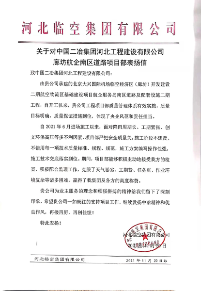 11月22日,中國二冶河北廊坊航企南區(qū)道路項(xiàng)目部收到河北臨空集團(tuán)有限公司表揚(yáng)信,對中國二冶的服務(wù)理念和頑強(qiáng)拼搏精神高度贊揚(yáng)。