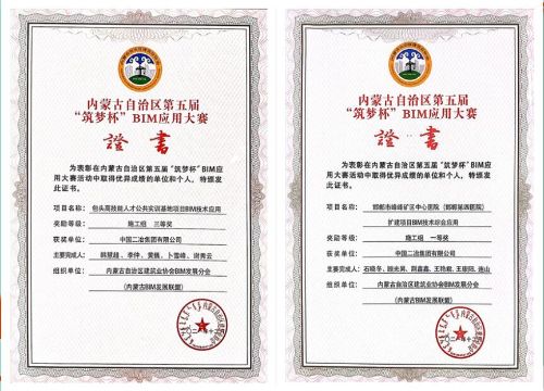 3月29日,中國二冶收到由內蒙古自治區建筑業協會頒發的第五屆“筑夢杯”BIM技術應用大賽獲獎證書,中國二冶“邯鄲市峰峰礦區中心醫院(邯鄲第四醫院)擴建項目BIM技術綜合應用”和“包頭高技能人才公共實訓基地項目BIM技術應用”分別榮獲施工組一等獎和三等獎。