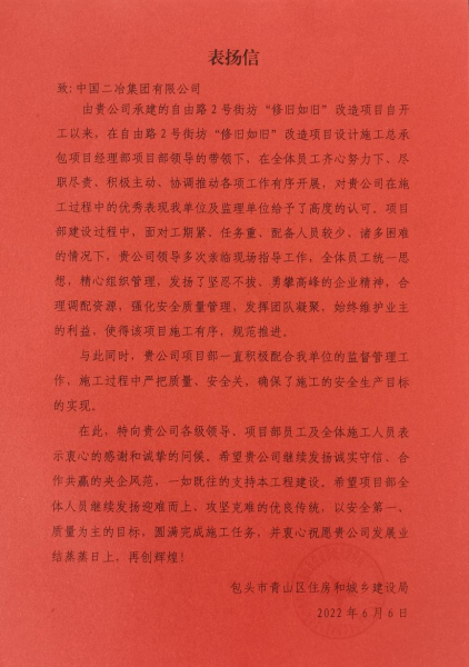 6月10日,中國二冶收到包頭市青山區住房和城鄉建設局發來的表揚信。信中贊揚中國二冶在青山區自由路2號街坊“修舊如舊”改造項目建設過程中,攻堅克難,精細部署,有序推進,以實際行動充分體現了二冶人的實干擔當。