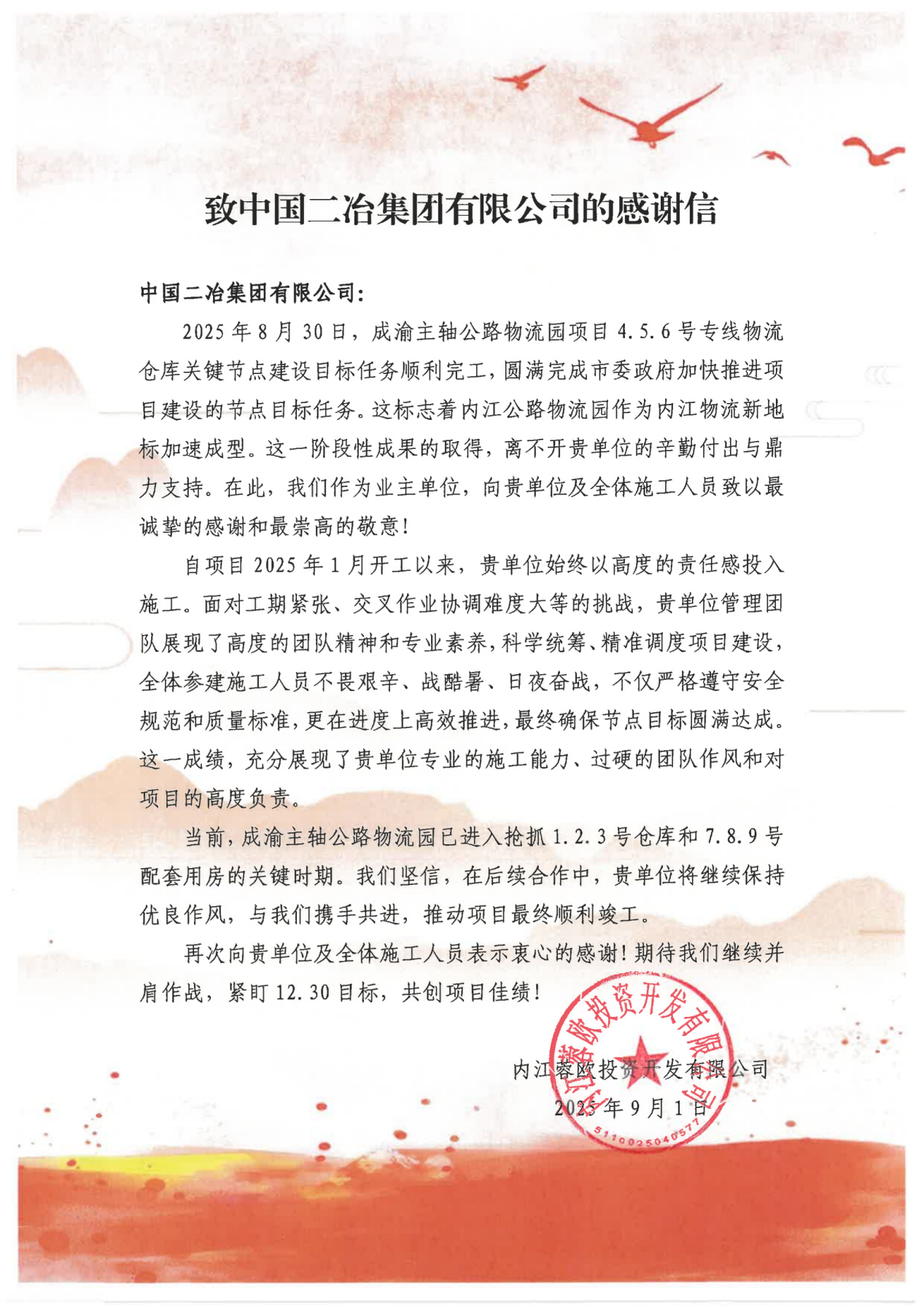 9月1日,中國二冶收到內江蓉歐投資開發有限公司感謝信,對中國二冶在成渝主軸公路物流園項目中,能夠以高度的責任感投入項目建設,圓滿完成關鍵節點目標任務致以最誠摯的感謝和崇高的敬意。