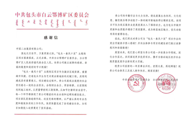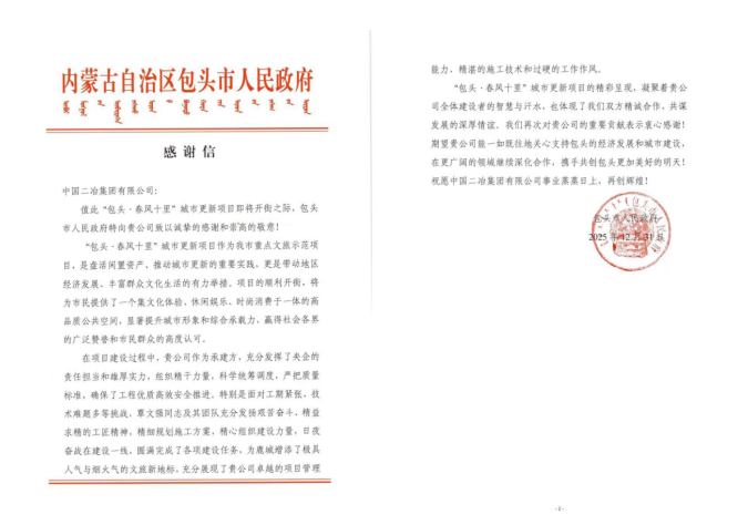 此次感謝及表揚(yáng),既是對(duì)中國二冶建設(shè)成果的高度認(rèn)可,也是對(duì)團(tuán)隊(duì)付出的充分信賴。未來,中國二冶將以此為激勵(lì),持續(xù)深耕包頭城市建設(shè)領(lǐng)域,以更多優(yōu)質(zhì)精品工程賦能地方發(fā)展,為推動(dòng)地區(qū)經(jīng)濟(jì)社會(huì)高質(zhì)量發(fā)展貢獻(xiàn)更大央企力量。