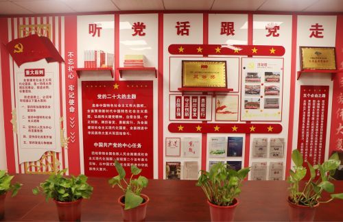 基于三個功能劃分,黨建活動室進行了整體的規劃,除了活動室所必須的桌椅外,主要建設內容包含了:建設一面宣誓墻。宣誓墻上展示內容可包括入黨誓詞、黨員權利、黨員義務及黨員制度等;同時,宣誓墻可為預備黨員宣誓、黨的重要節日和黨的理論學習時提供黨員再教育的功能;建設一面黨的二十大精神的宣傳墻,宣傳墻上主要內容有黨的二十大的主題、中國共產黨的中心任務,以及五個必由之路等內容,切實宣傳貫徹黨的二十大精神;建設一面活動宣傳欄。活動宣傳欄的功能主要用于日常黨務以及各黨支部特色活動的宣傳、展示,也可以作為問題討論書寫的空間;建設一面展示柜,其中包括了榮譽展示、書籍陳列和資料收集保存三個功能化區域,可充分展示華東分公司黨建所獲榮譽、陳列黨建書籍和專業書籍等;建設一個黨務公開欄,黨務公開欄主要放置日常黨務、學習心得、談心談話以及集團公司報紙報刊,并實時更新,供黨員參考學習;